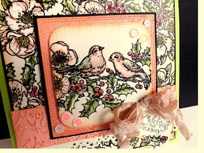 The Power Poppy Bits & Pieces challenge is to use only part of an image. I've been waiting all year to ink up this sweet vintage image and I thought it would be perfect for the color challenge as a non traditional Christmas card. I heat embossed the main image, as well as the background flowers and watercolored with Stampin Up markers. I sponged the layers, as well as a tag with the greeting, and added a bit of holly and a seam binding bow.