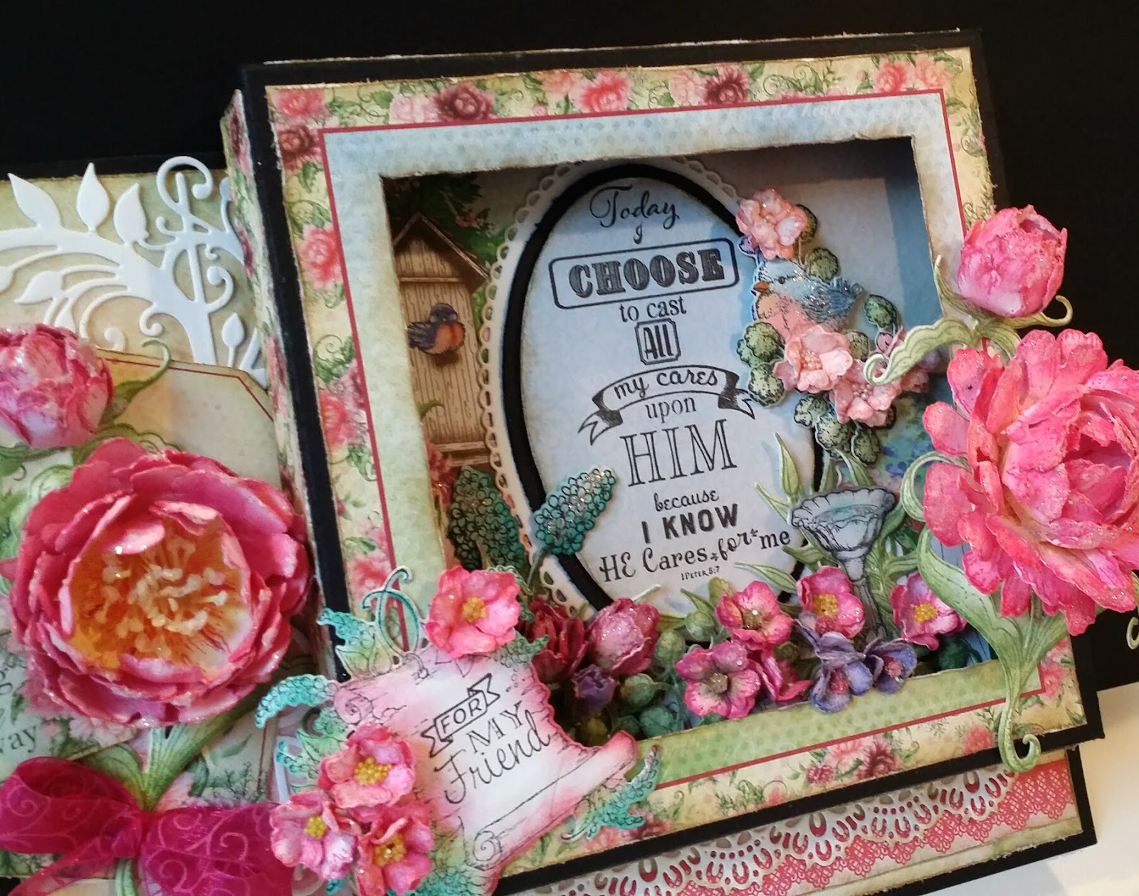 I created a garden in a shadow box, full of blooming flowers, birds, and also a very inspirational verse,